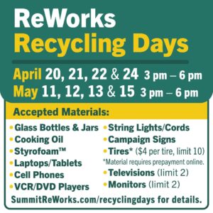 ReWorks is hosting multiple “ReWorks Recycling Days” this spring from 3 p.m. to 6 p.m. at ReWorks, 1201… Read More
