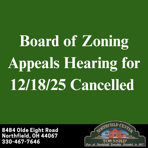 Northfield Center Township would like to inform residents that the Board of Zoning Appeals Public Hearing originally scheduled for Thursday, December 18, 2025, at 7:00 PM for a Conditional Use Hearing for applicant Spitzer Hardware & Supply Co. (Spitzer Chevrolet), 333 E. Aurora Road, has been cancelled.