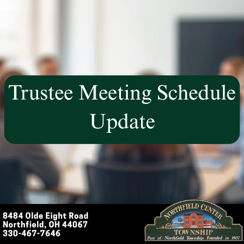 Please note that the Northfield Center Township Trustee Regular Meeting originally scheduled for Monday, January 5, 2026, has been rescheduled to Tuesday, January 13, 2026.