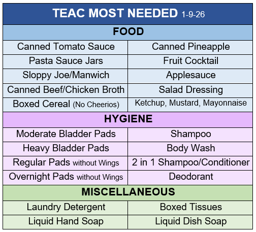 Residents who are able are encouraged to consider donating one or more of the items shown in the photo. These donations help TEAC maintain essential resources and provide timely support to neighbors facing hardship.