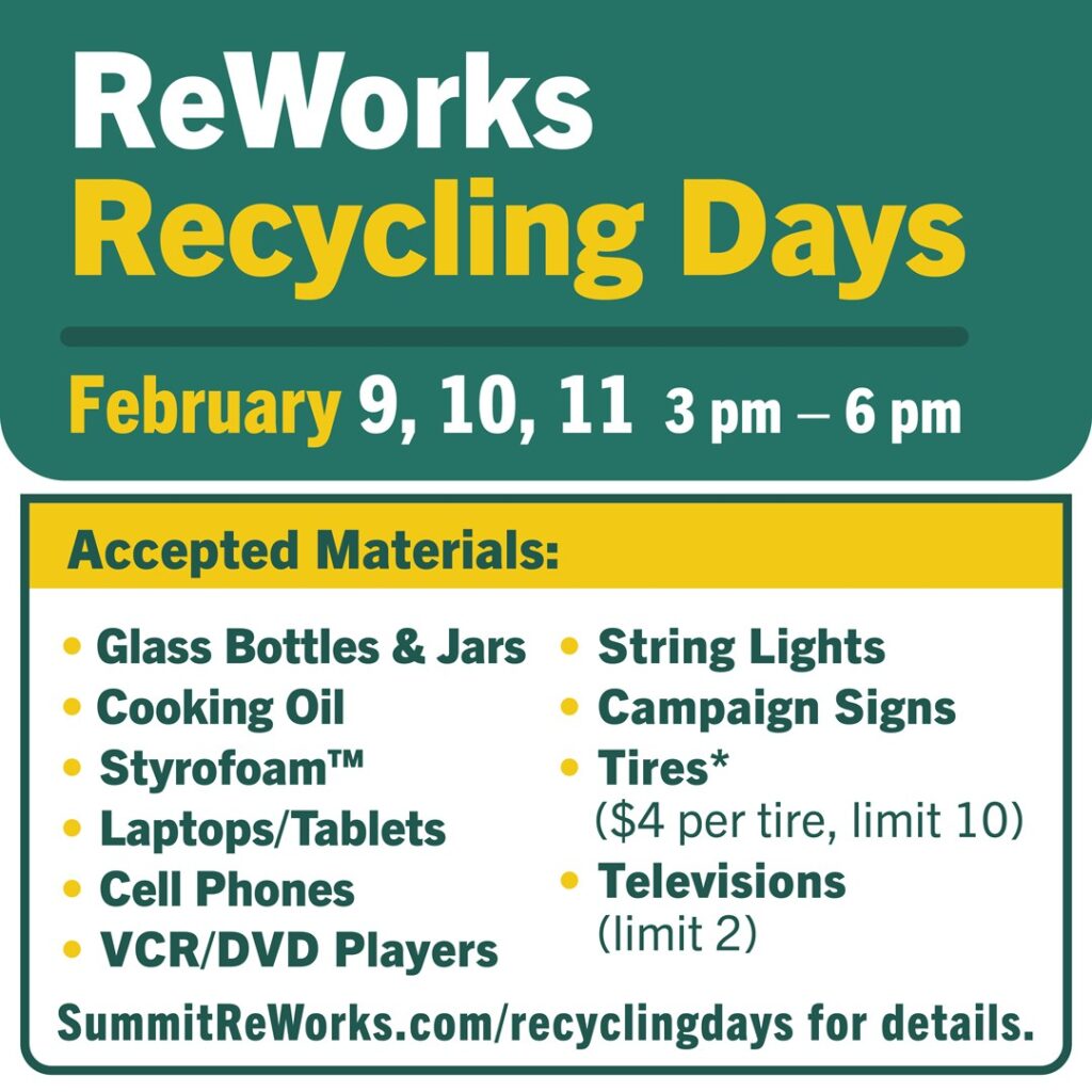 ReWorks is hosting three “ReWorks Recycling Days” on February 9th, 10th, and 11th from 3 pm to 6 pm at ReWorks, 1201 Graham Road in Stow. These special collections are for Summit County residents and businesses only and accept specific materials that are recyclable beyond home recycling carts – like tires (with prepayment), electronics, glass bottles and jars, cooking oil, Styrofoam™, string lights, and campaign signs. No household hazardous waste or other unlisted items will be accepted.