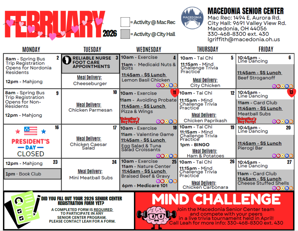 Looking for ways to stay active, social, and engaged this month? The Macedonia Senior Center has a full calendar of events and programs planned for February, including exercise classes, educational sessions, games, bus trips, and more!