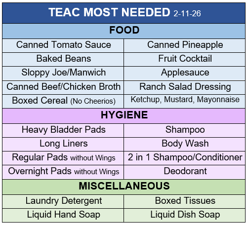 The Emergency Assistance Center (TEAC) plays an important role in supporting individuals and families in our community, and their work is made possible through the generosity of local residents. Shown above is TEAC’s current list of most needed items, which highlights the everyday essentials they are seeking at this time.