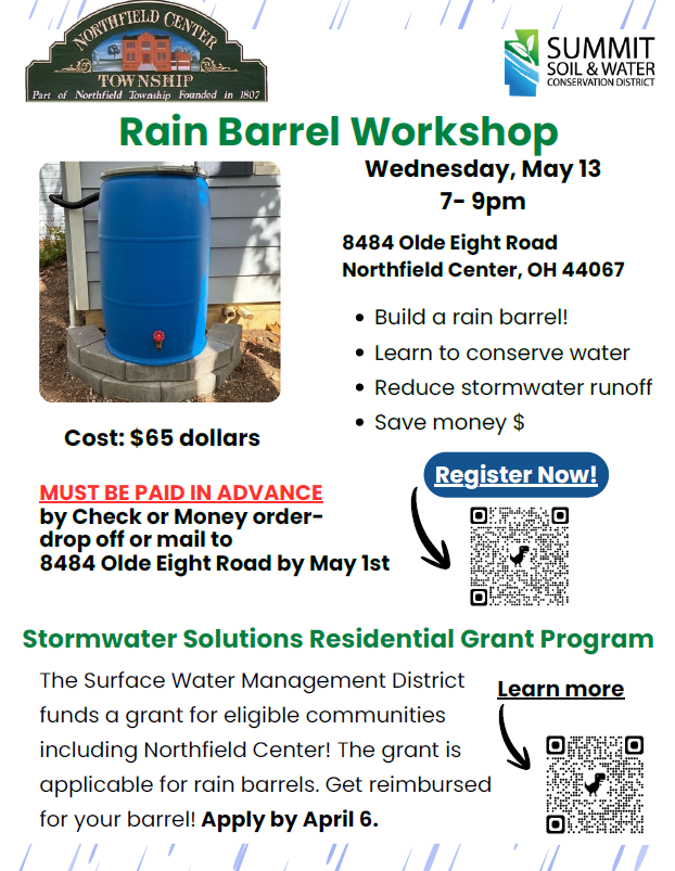 Northfield Center residents are invited to take part in an upcoming Rain Barrel Workshop designed to help homeowners conserve water and reduce stormwater runoff. Participants will learn how rain barrels work, why they are beneficial for local waterways, and will build their own barrel to take home. This hands-on workshop is a great opportunity to make a positive environmental impact while also saving money on outdoor water use. Residents may also be eligible for reimbursement through the Stormwater Solutions Residential Grant Program funded by the Summit County Surface Water Management District.